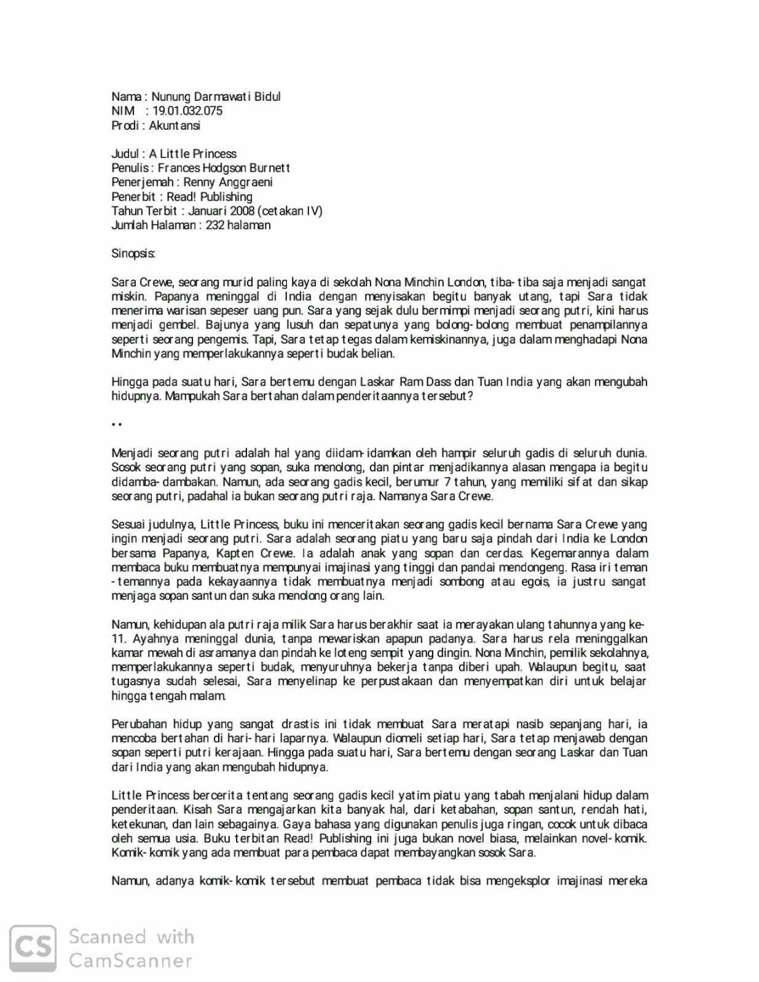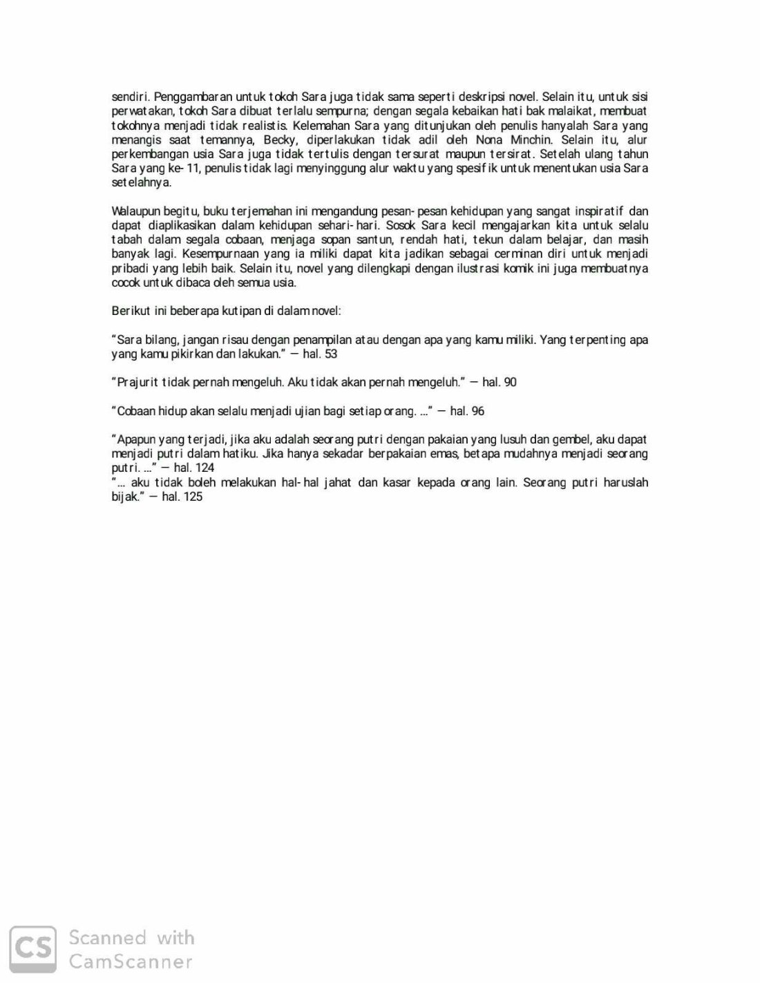 Little Princess bercerita tentang seorang gadis kecil yatim piatu yang tabah menjalani hidup dalam penderitaan. Kisah Sara mengajarkan kita banyak hal, dari ketabahan, sopan santun, rendah hati, ketekunan, dan lain sebagainya. Gaya bahasa yang digunakan penulis juga ringan, cocok untuk dibaca oleh semua usia. Buku terbitan Read! Publishing ini juga bukan novel biasa, melainkan novel-komik. Komik-komik yang ada membuat para pembaca dapat membayangkan sosok Sara.